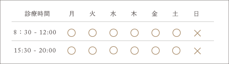 | 受付時間 | 8:30~12:00, 15:30~20:00 |